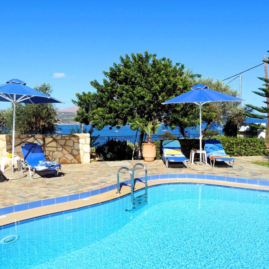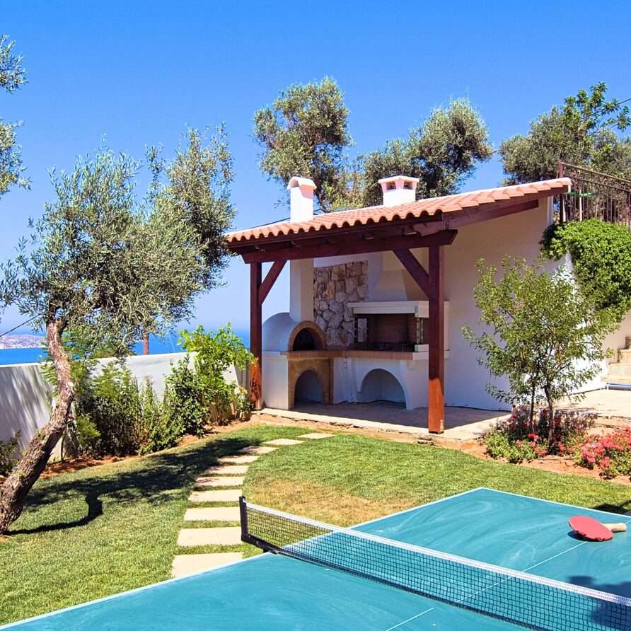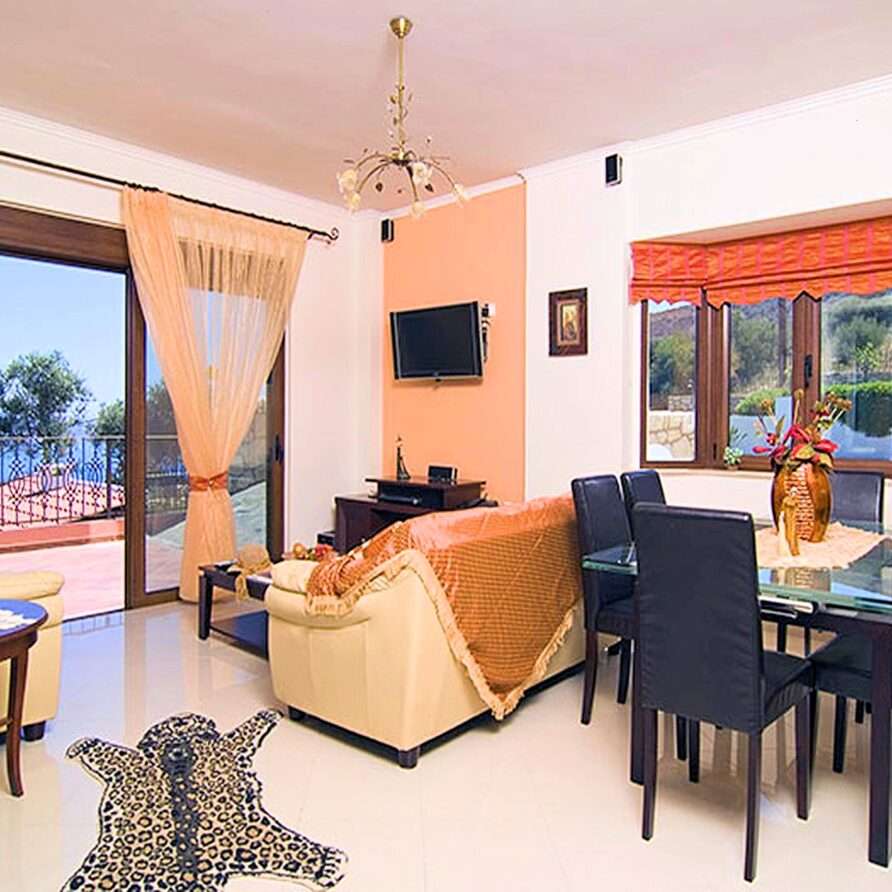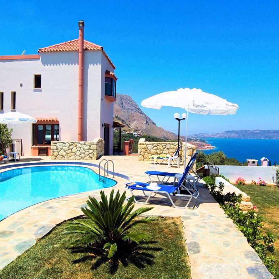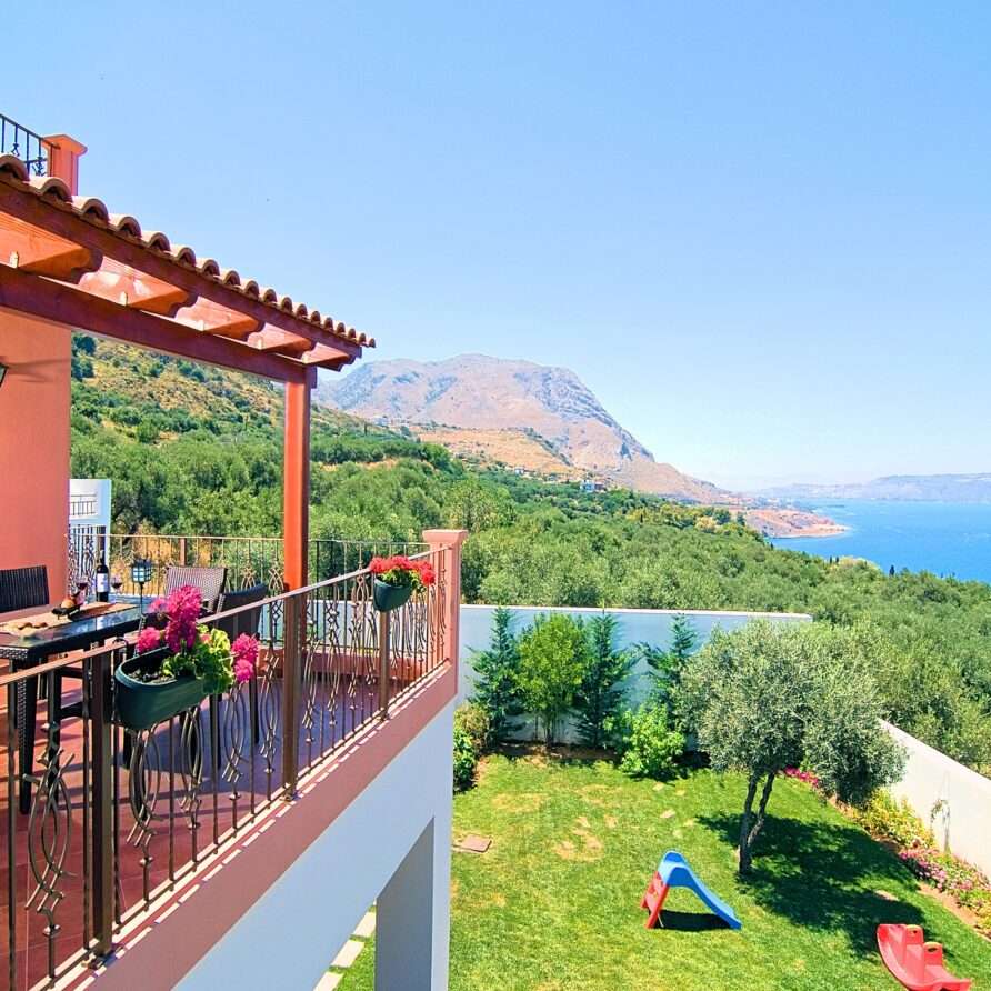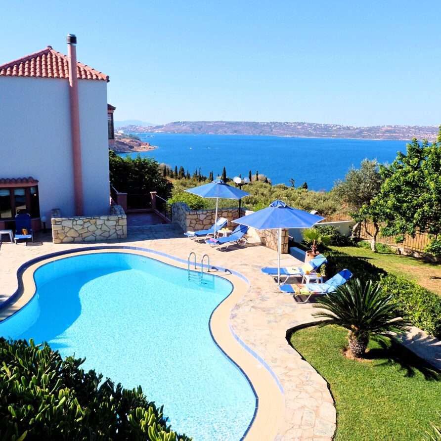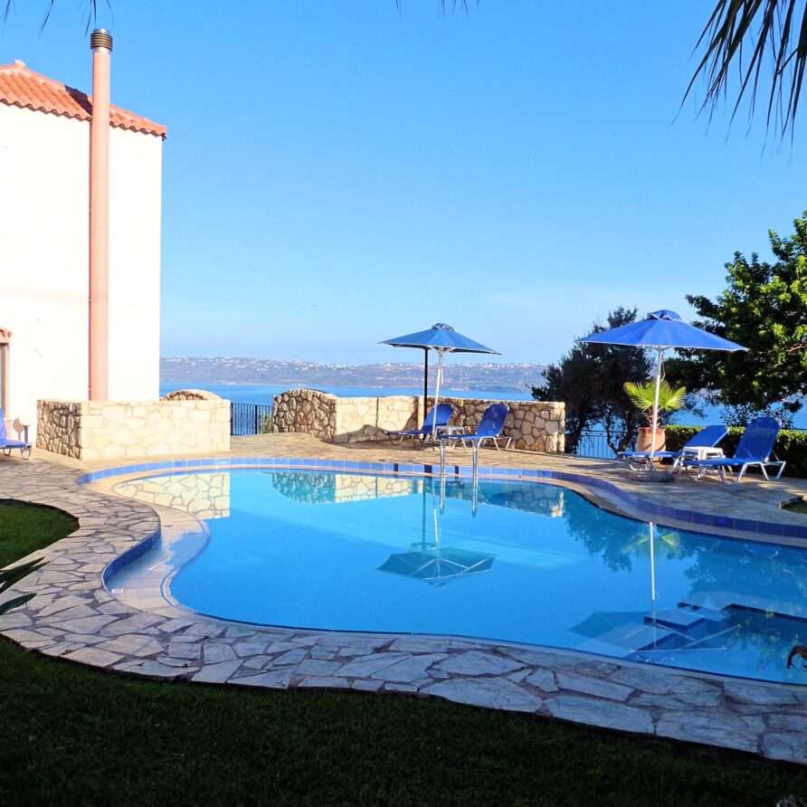 The main entrance leads to the raised ground floor which offers a fully fitted modern kitchen with dining area, an open plan living room and a guest’s WC. All areas lead to sea facing balconies and the swimming pool. Marble stairs lead to both the first floor and the garden level. At the first floor, you will find the master double bedroom with en suite shower room and a twin room with an adjacent bathroom which includes a Jacuzzi bath. Both rooms share a balcony that offers breath taking views of Souda Bay, especially during sunrise and sunset. At the garden level there’s one more double bedroom, a bathroom with shower, a second kitchen, a living room with fireplace and the utility room