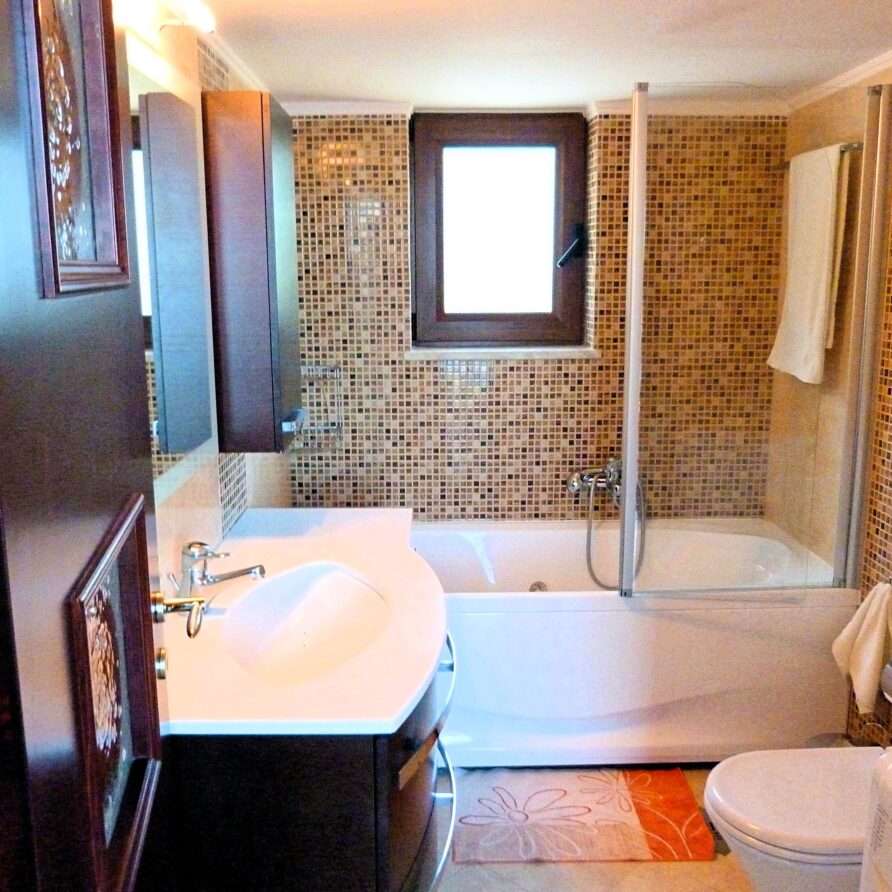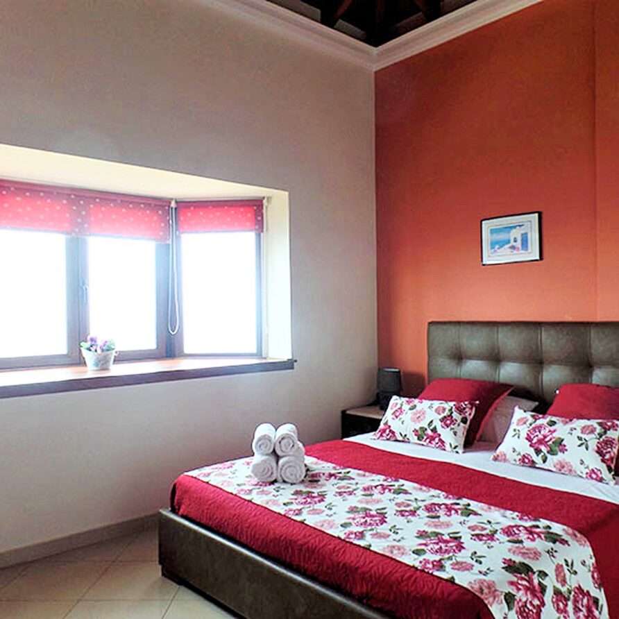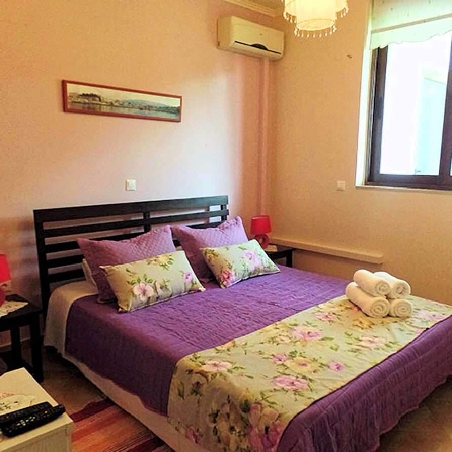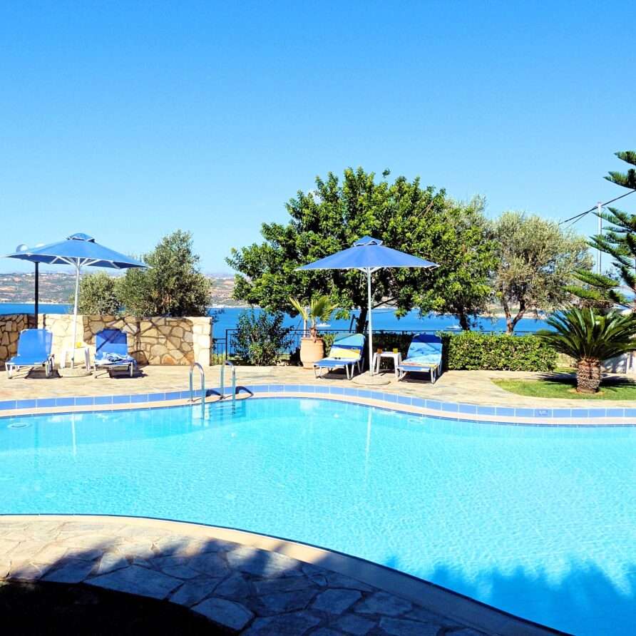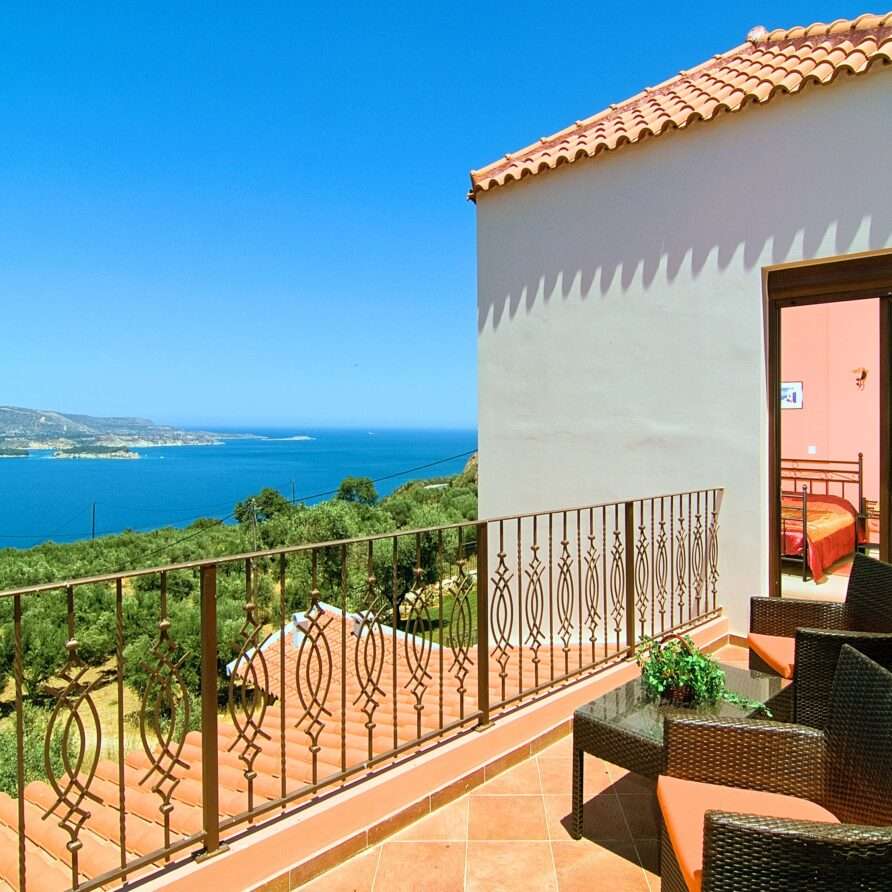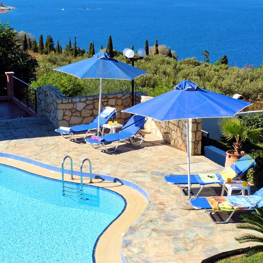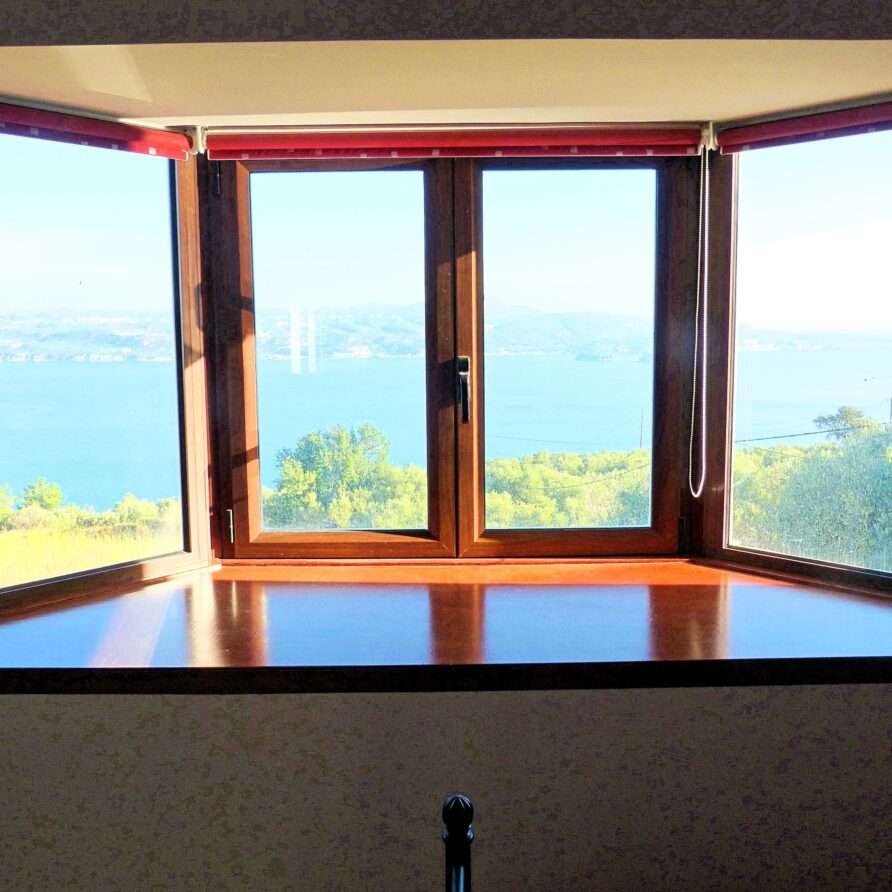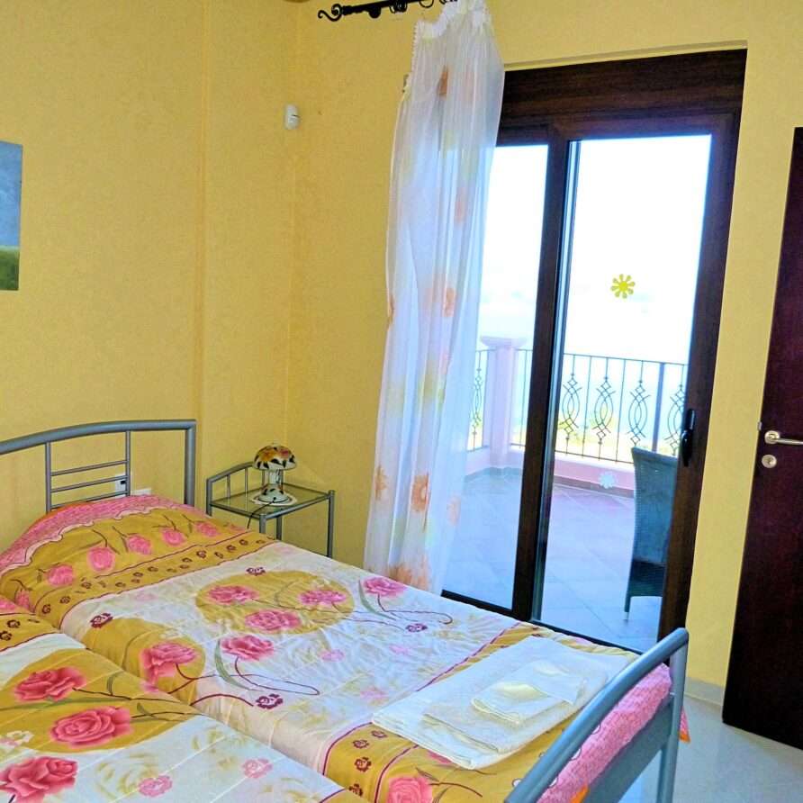 The main entrance leads to the raised ground floor which offers a fully fitted modern kitchen with dining area, an open plan living room and a guest’s WC. All areas lead to sea facing balconies and the swimming pool. Marble stairs lead to both the first floor and the garden level. At the first floor, you will find the master double bedroom with en suite shower room and a twin room with an adjacent bathroom which includes a Jacuzzi bath. Both rooms share a balcony that offers breath taking views of Souda Bay, especially during sunrise and sunset. At the garden level there’s one more double bedroom, a bathroom with shower, a second kitchen, a living room with fireplace and the utility room