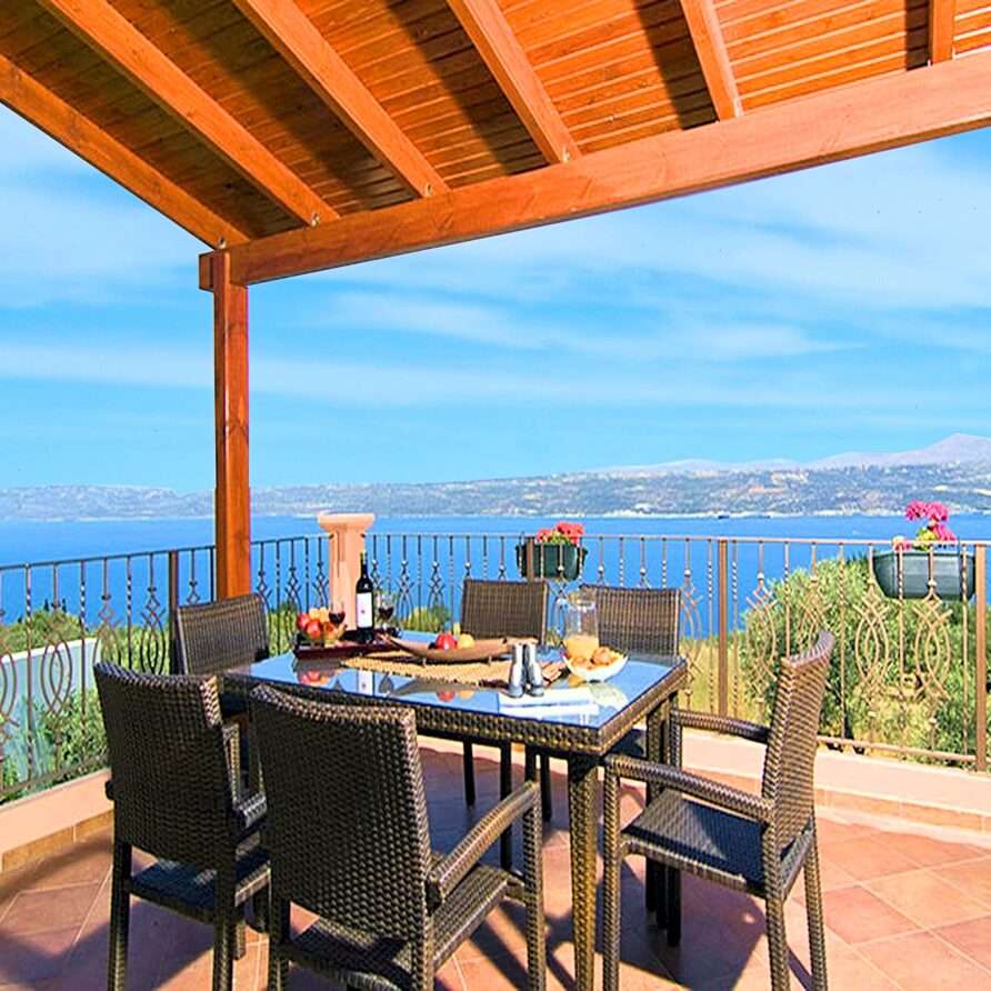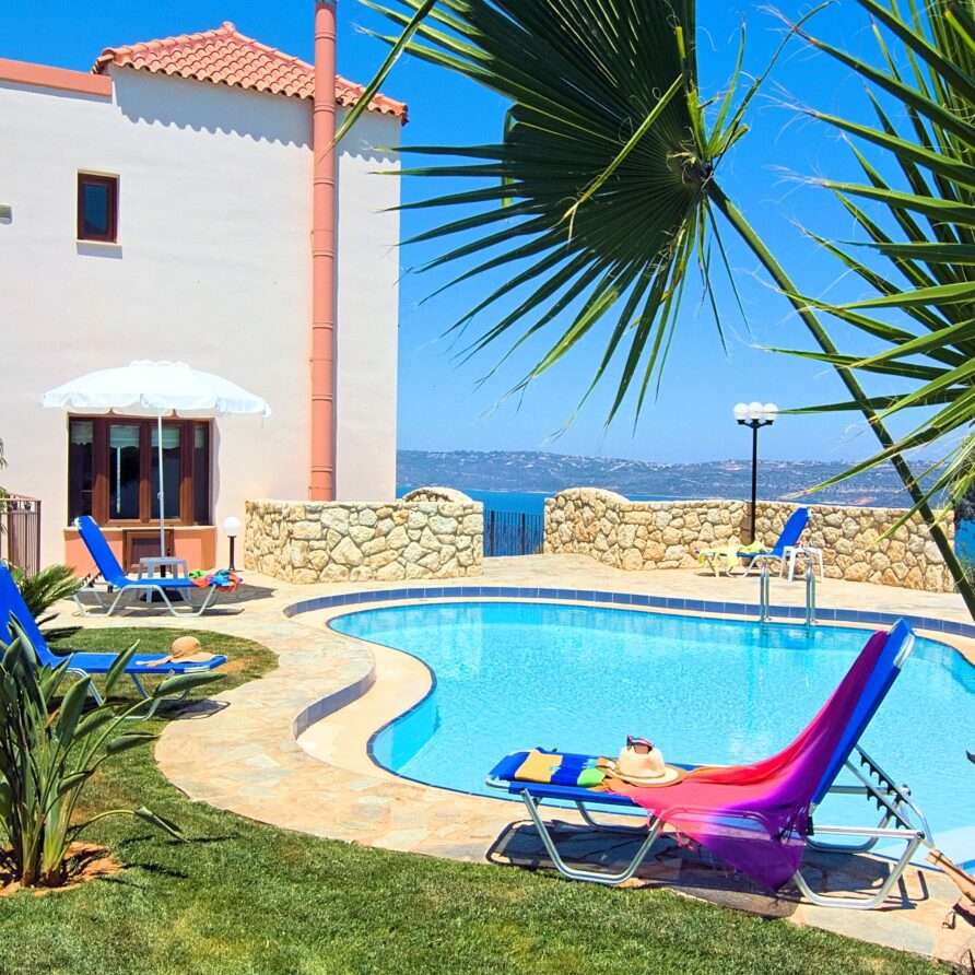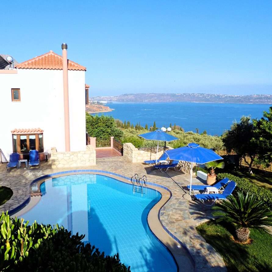 Villa Amal is located in a secluded area of Aptera village and it’s only a short distance (2,5km) from its world famous archaeological site. Its distance from Souda port and Chania town is 6km (5 min. drive) and 13km (15 min. drive) respectively. The villa is surrounded by olive trees and offers spectacular views of Souda Bay and Akrotiri peninsula.